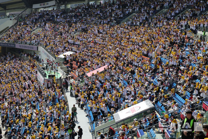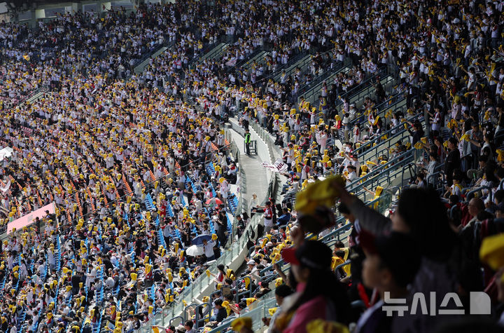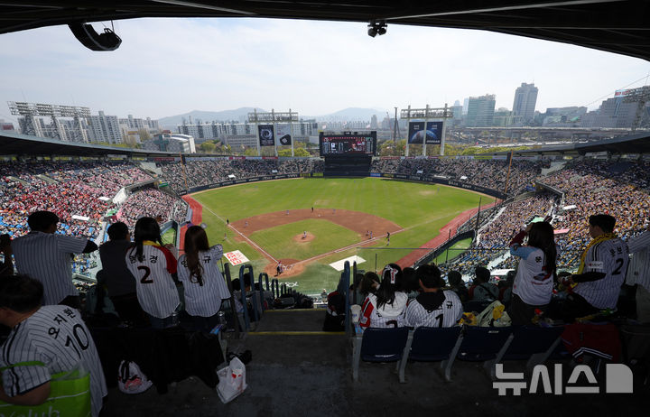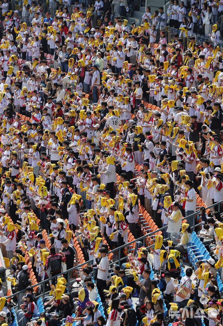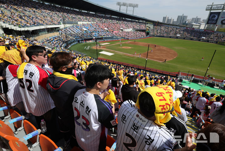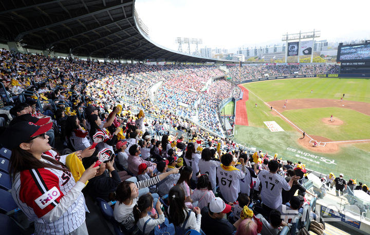 【NEWSIS】12日、ソウル市松坡区の蚕室スタジアムで、2026新韓SOL KBO(韓国プロ野球)リーグのSSGランダーズ対LGツインズの試合が行われた。写真は応援する観客たち。韓国野球委員会によると、開幕から今月10日までの累計観客動員数は101万1465人だとのことだ。これは史上最少試合数である55試合、開幕後最短の14日間での記録だ。