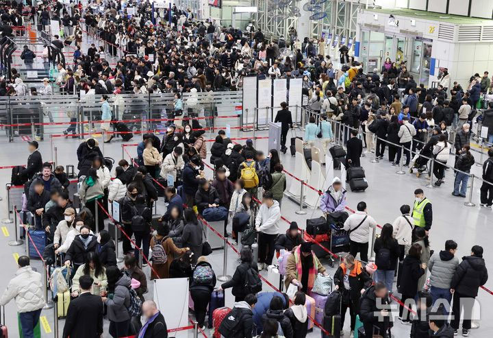 ▲2026年2月13日、釜山・金海国際空港国際線ターミナルで、海外へ向かうため出国手続きをしようと行列して待つ旅行客たち。写真=ハ・ギョンミン記者