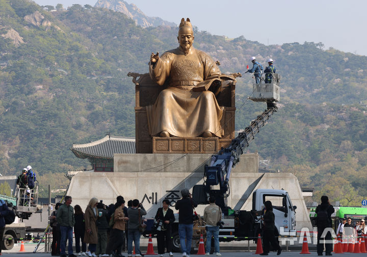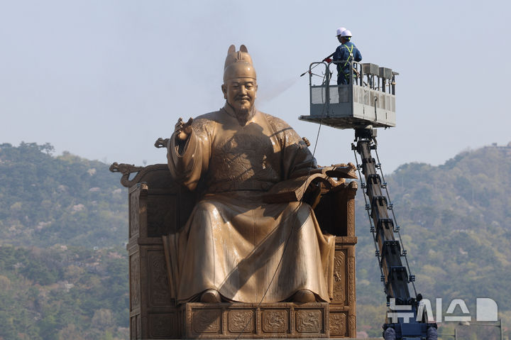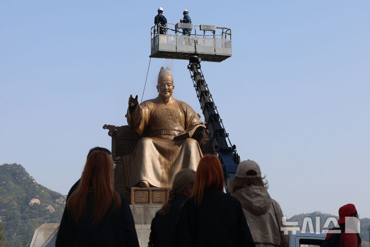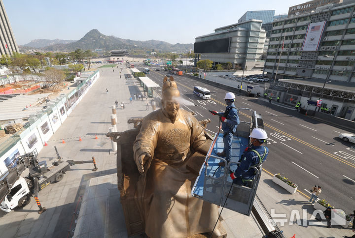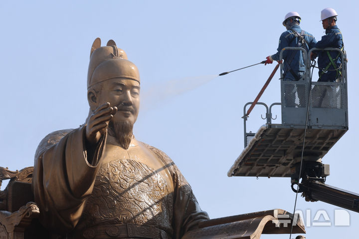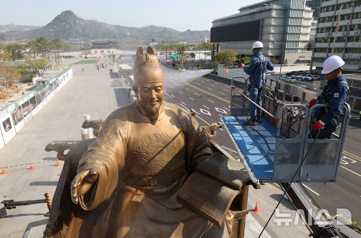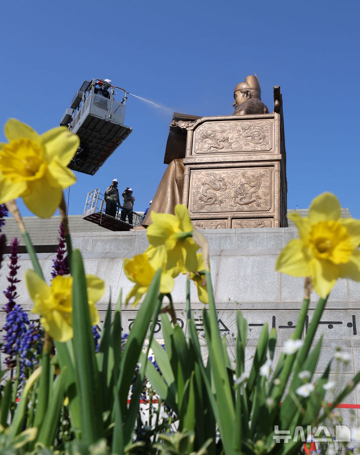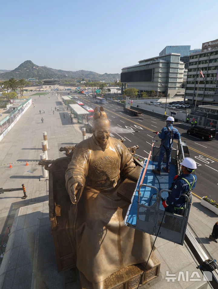 【NEWSIS】春らしい陽気となった13日午前、ソウル市鍾路区の光化門広場で、世宗大王像を洗うソウル市関係者たち。