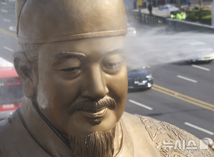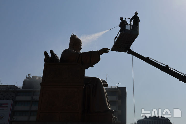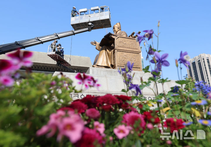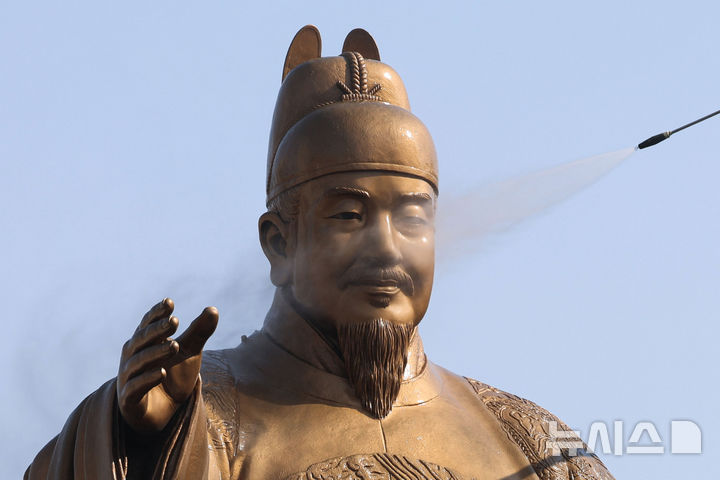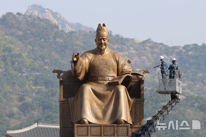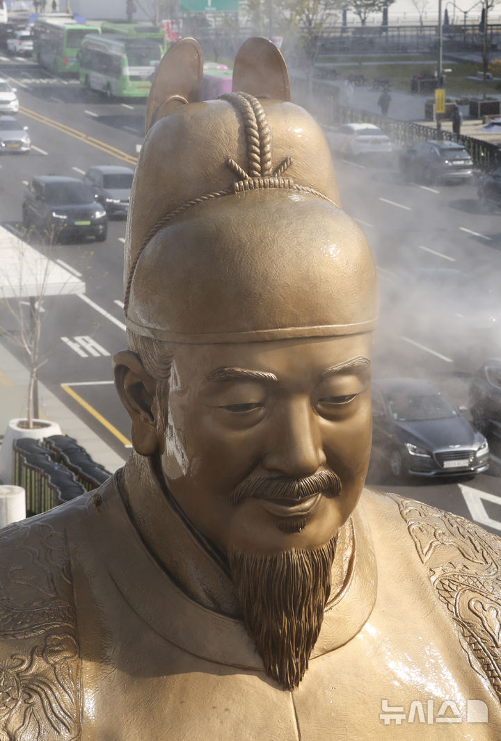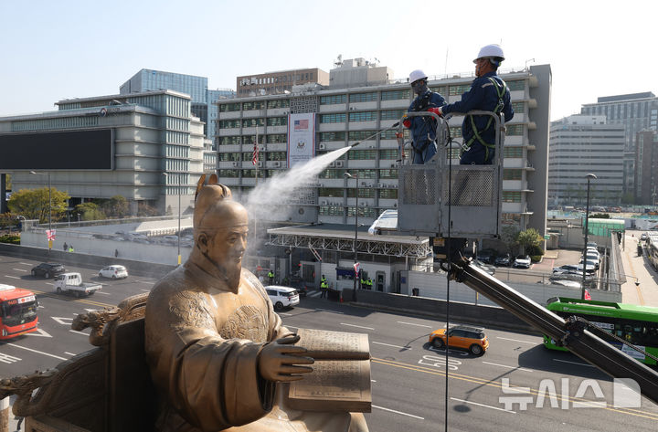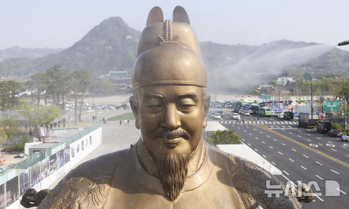 【NEWSIS】春らしい陽気となった13日午前、ソウル市鍾路区の光化門広場で、世宗大王像を洗うソウル市関係者たち。
