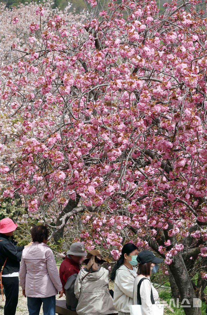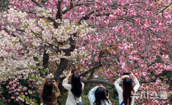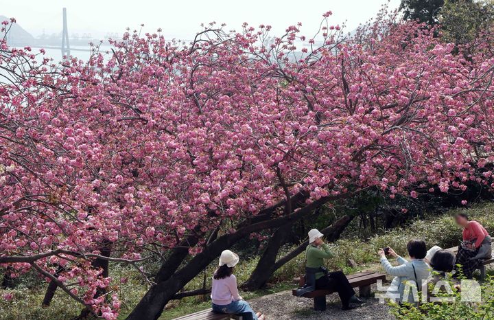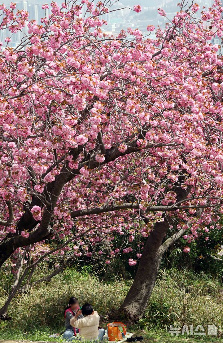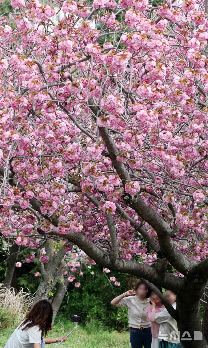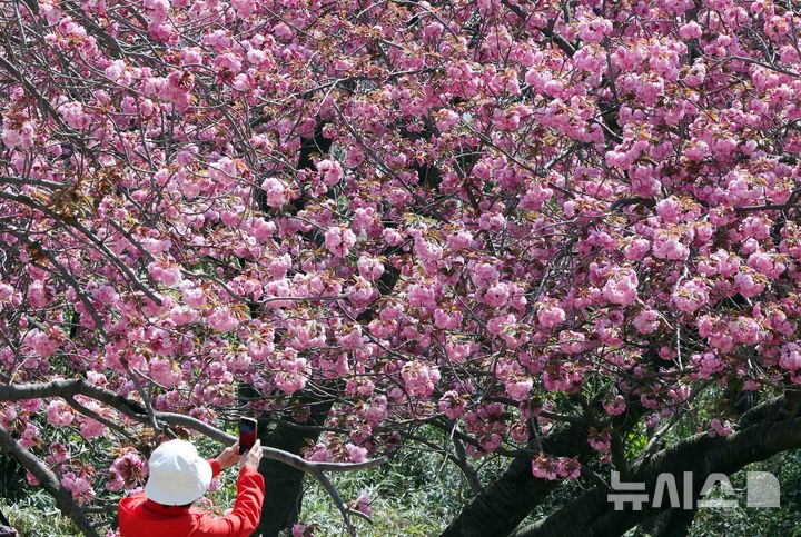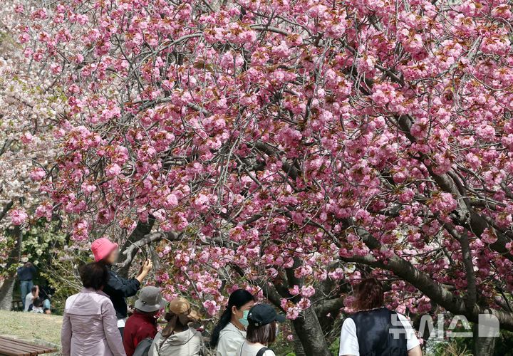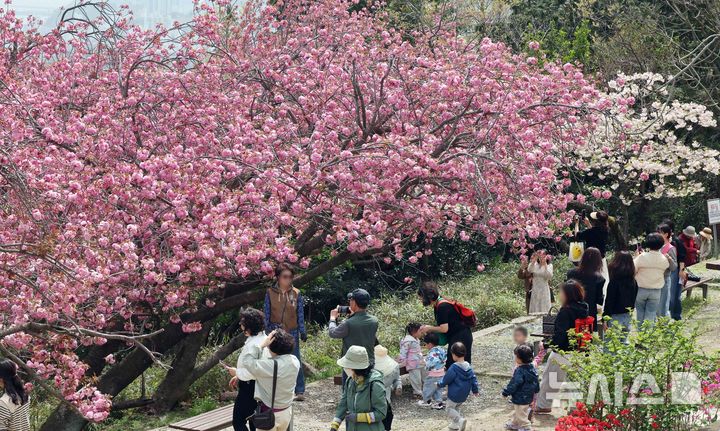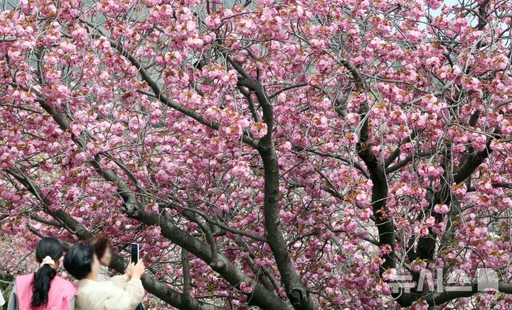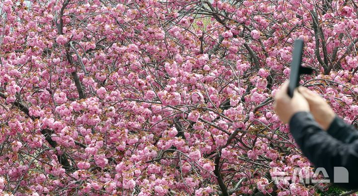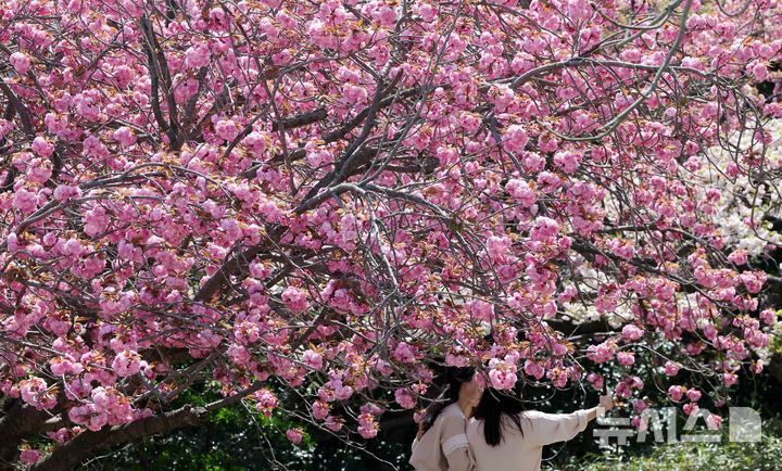【NEWSIS】うららかな春の天気となった13日、釜山市中区の民主公園では、訪れた市民や観光客が大きく咲いた八重桜を背景に記念撮影をして春のお出かけを楽しんでいた。
