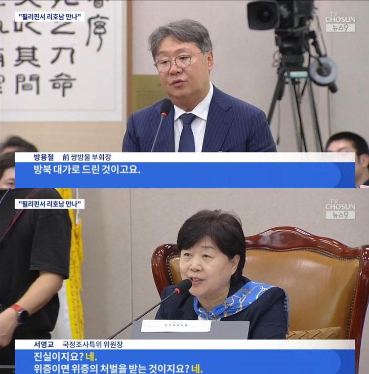 徐委員長は「(リ・ホナムの)顔を見たのか」「何時に会ったのか」「どこで会ったのか」と追及し、パン前副会長は「リ・ホナムが夕方われわれが宿泊していた(マニラの)オカダホテルを訪ねてきた。ホテルの裏門で出迎え、会長(キム・ソンテ)のいる部屋まで案内した」とし、「準備していったカネは会長が直接渡した」と当時の状況を具体的に証言した。徐委員長が「偽証すればどうなるか分かっているのか」と釘を刺したが、パン前副会長は供述を変えなかった。