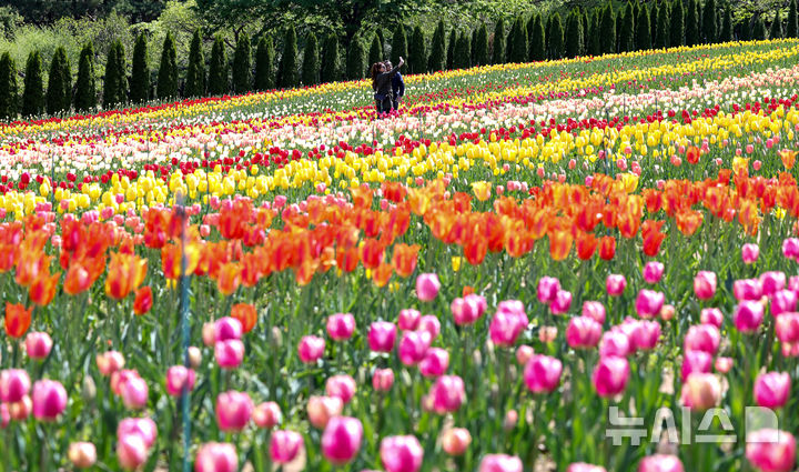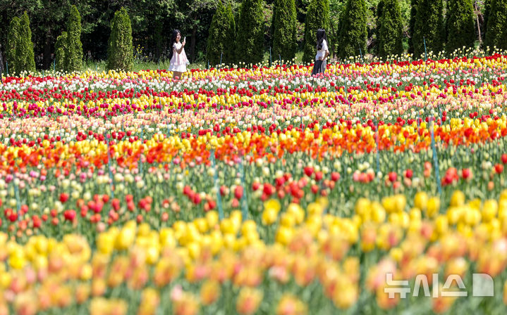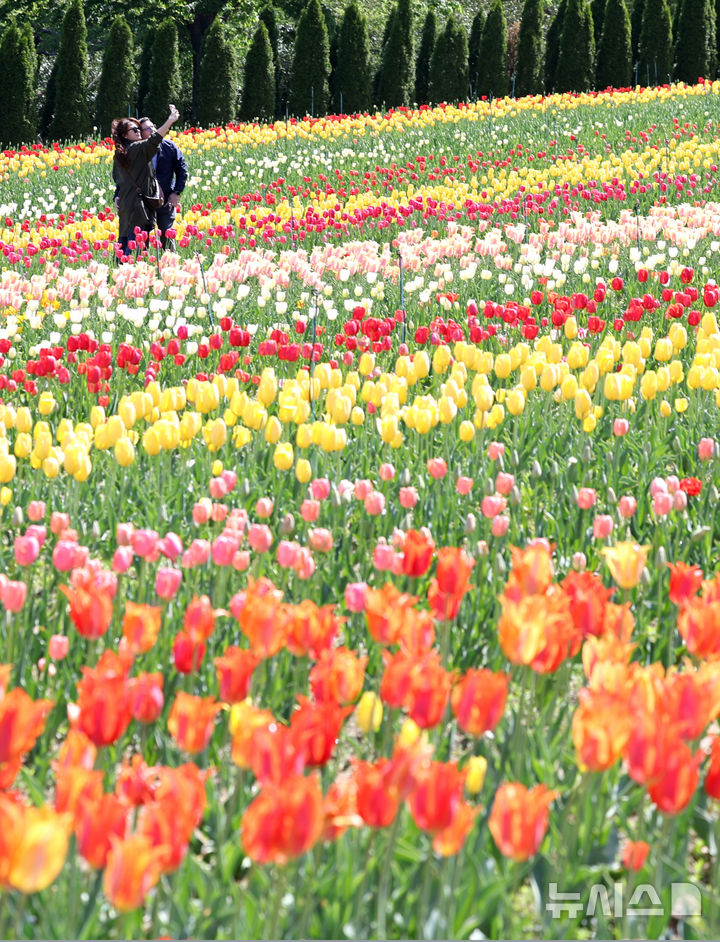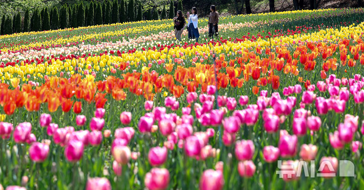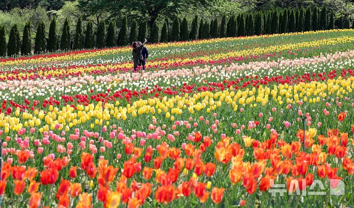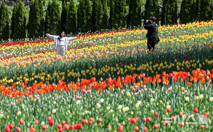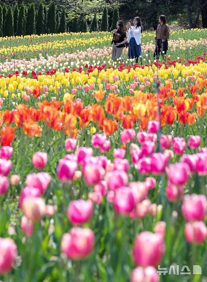 【NEWSIS】いかにも春らしい一日となった16日、大邱市達西区に位置するE-Worldでは、フォーシーズン・チューリップガーデンを訪れた外国人留学生たちが大きく咲いたチューリップを背景に写真を撮っていた。