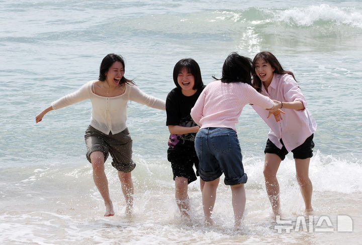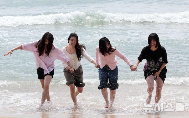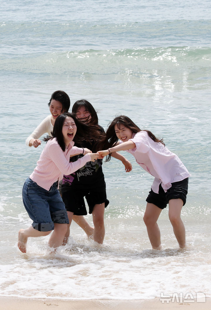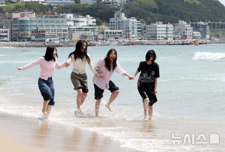 【NEWSIS】全国的に初夏のような陽気が続いた19日、釜山市海雲台区の海雲台海水浴場では、波打ち際で遊ぶ観光客の姿があった。