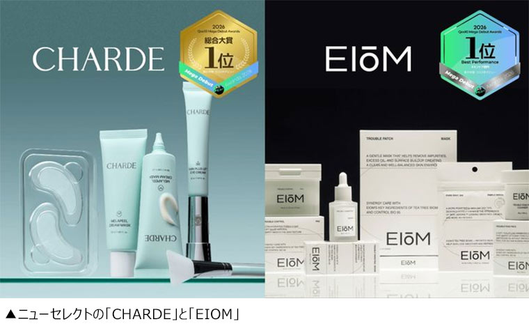 ライフスタイル・コマース・グループ「New Select(ニューセレクト)」の代表的なブランド「CHARDE(シャルド)」と「EIOM(イオム)」が日本のECプラットフォーム「Qoo10(キューテン)ジャパン」主催の「メガデビューアワード」でそれぞれ1位と2位を獲得した。