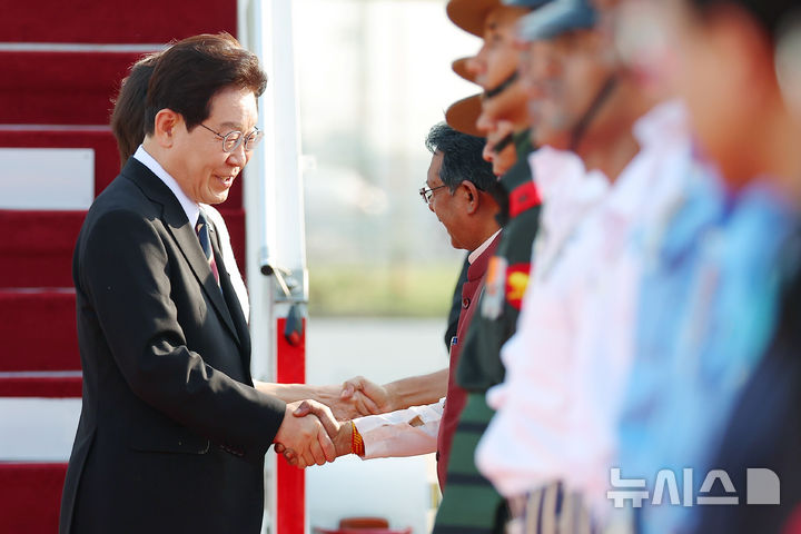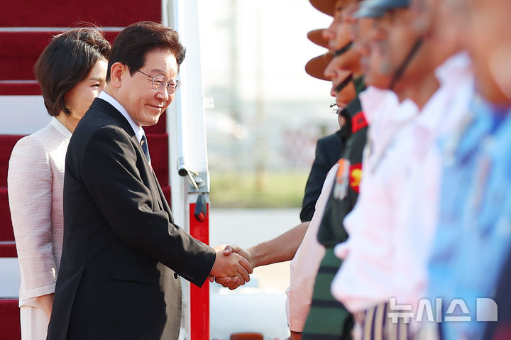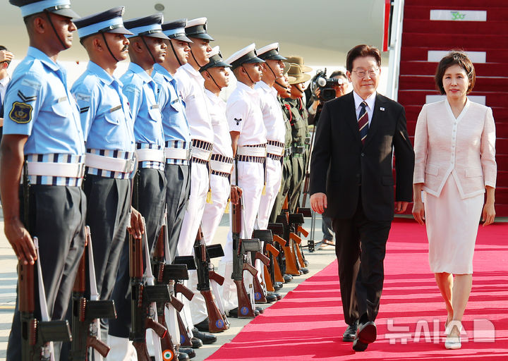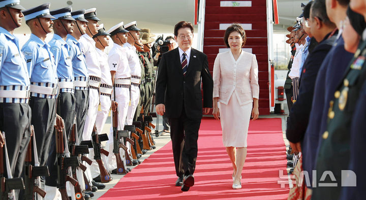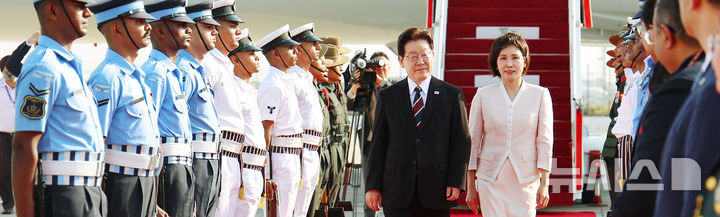 【NEWSIS】インドを国賓として訪問した李在明(イ・ジェミョン)大統領と金恵景(キム・ヘギョン)夫人が19日(現地時間)、インドのパラム空軍基地に到着した。