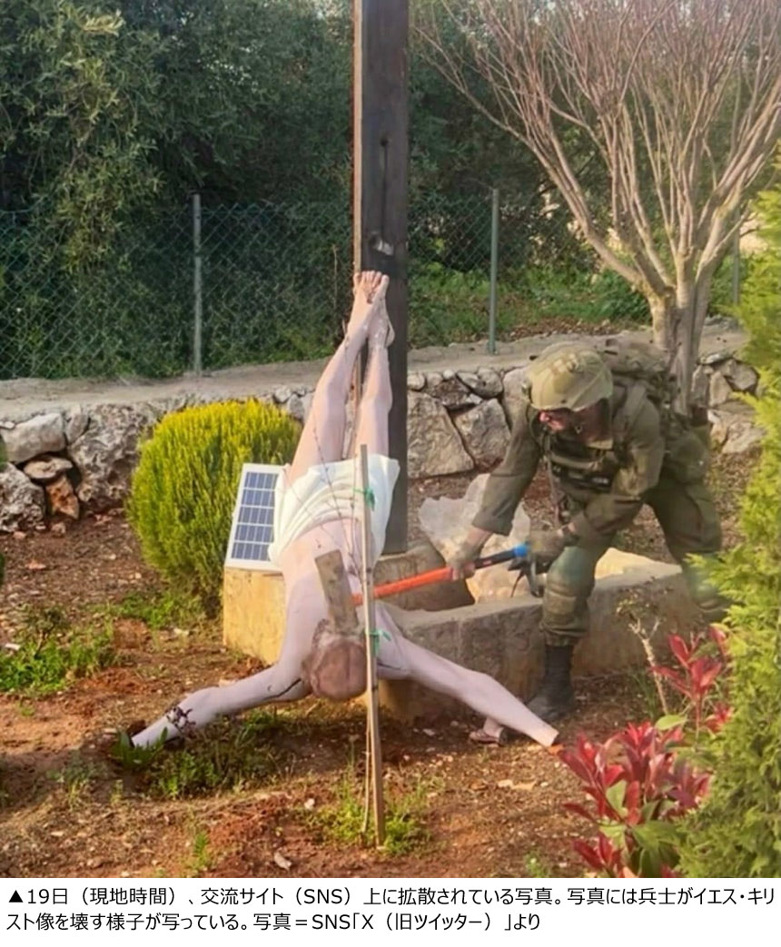 レバノン南部で作戦遂行中、イエス・キリスト像を破壊するイスラエル兵が写っている写真が交流サイト(SNS)上で拡散され、物議を醸している。これに対してイスラエル軍側は自国の兵士であると見られると認めた上で、「調査結果に基づき、適切な措置を取る」と述べた。