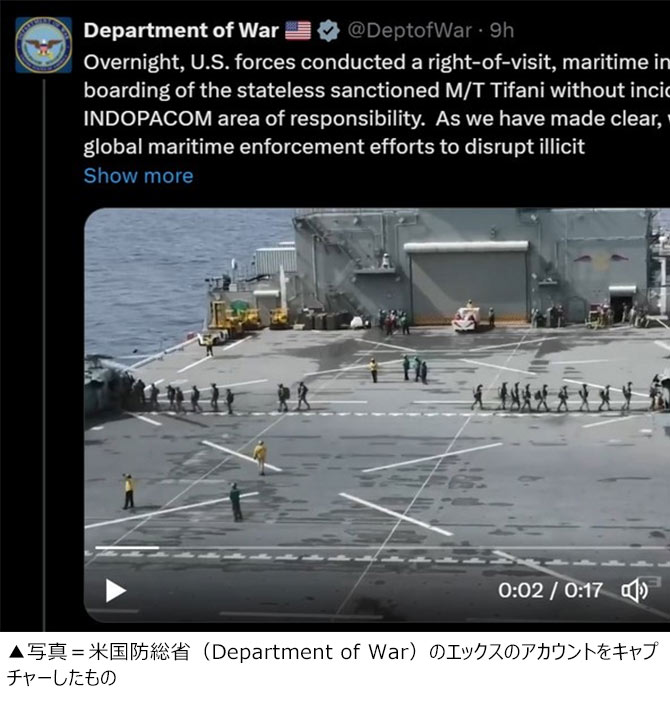 さらに国防総省は「われわれはあらゆる場所で、イランが営む違法ネットワークを妨害し、制裁船舶を取り締まるための努力を行う」「国際海域は制裁を受ける船の避難場所ではない」と強調した。