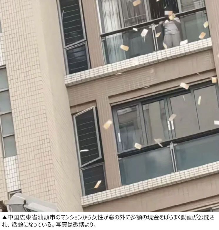 16日の香港紙スタンダードなどによると、14日午前10時(現地時間)ごろ、中国広東省汕頭市竜湖区のマンションのバルコニーから住民の女性が大量の紙幣をまいた。