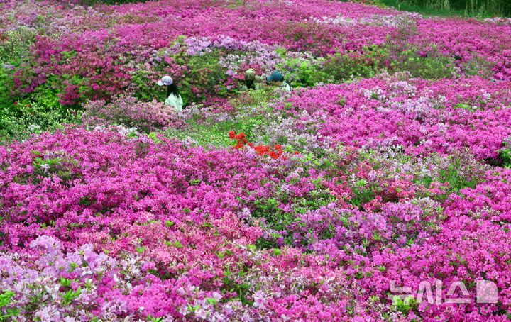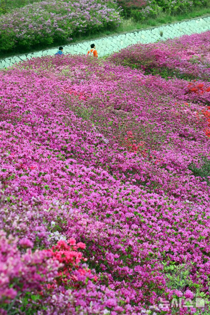 【NEWSIS】22日、釜山市釜山鎮区の白楊山・愛鎭峯近くに造成されたツツジ園を訪れた市民が記念撮影をしている様子。釜山鎮区は、1990年12月24日に発生した大規模な山火事で山肌が露出してしまった白楊山の頂上付近に2007年から毎年ヤマツツジを植えて、現在ではおよそ23万本のツツジが植えられた花園になっている。
