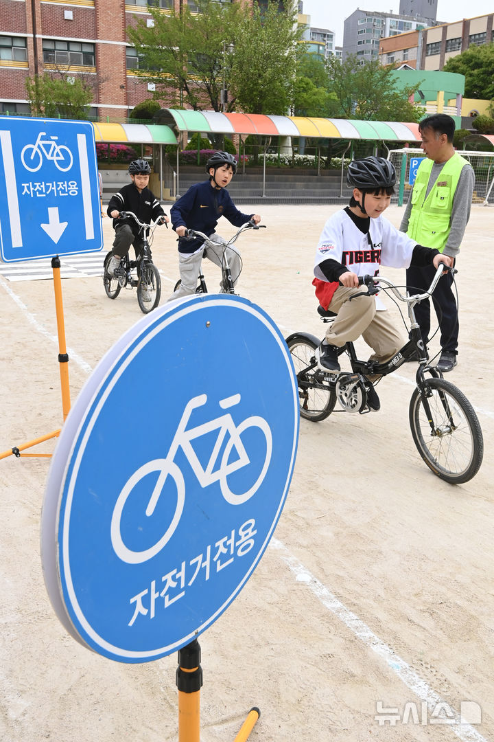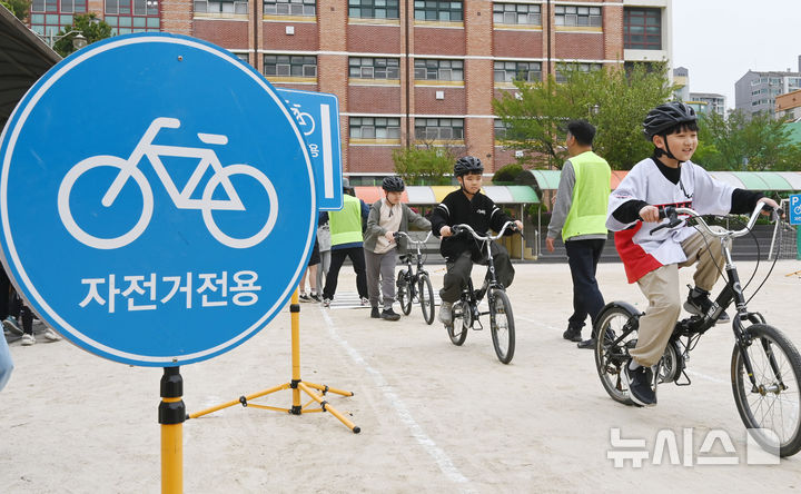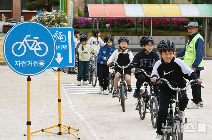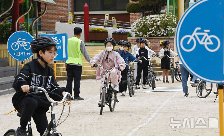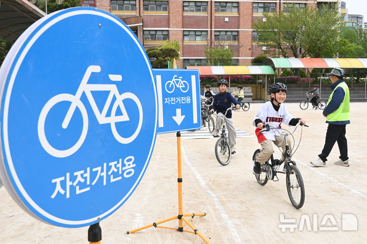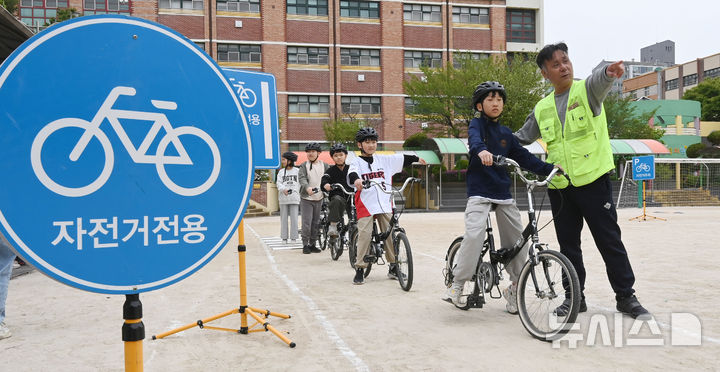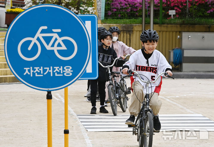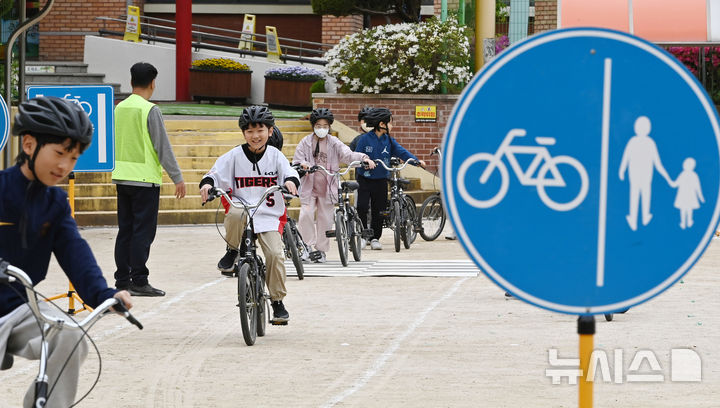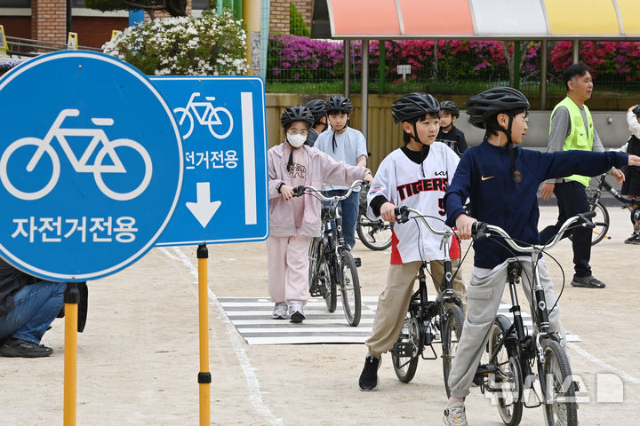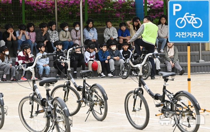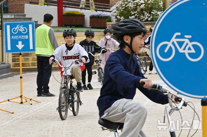 【NEWSIS】「自転車の日」にあたる22日、京畿道水原市のミョンタン小学校で自転車および個人型移動装置(パーソナルモビリティ/PM)の安全に関する出前教育が行われ、児童が「自転車と環境社会的協同組合」の関係者から安全教育を受けた。この日実施された安全教育では、保護装具の着用要領、交通標識と法規、安全な走行方法などが子どもたちに伝えられた。