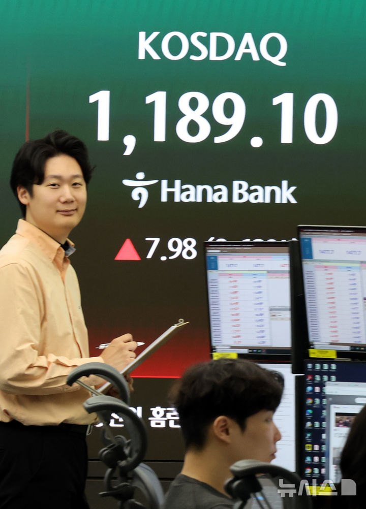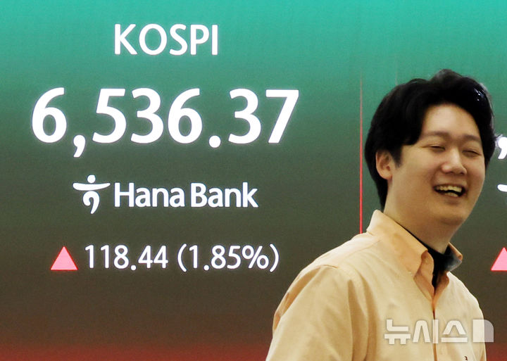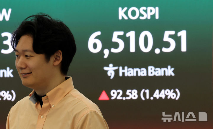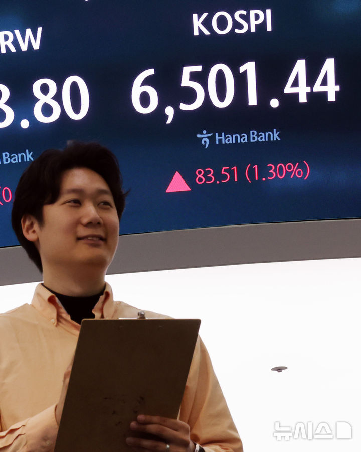 【NEWSIS】韓国総合株価指数(KOSPI、コスピ)は前取引日の6417.93より70.90ポイント(1.10%)高い6488.83で取引を開始した直後、6500の大台に乗った。写真は23日午前、ソウル市中区のハナ銀行ディーリングルームで業務を行うディーラー。