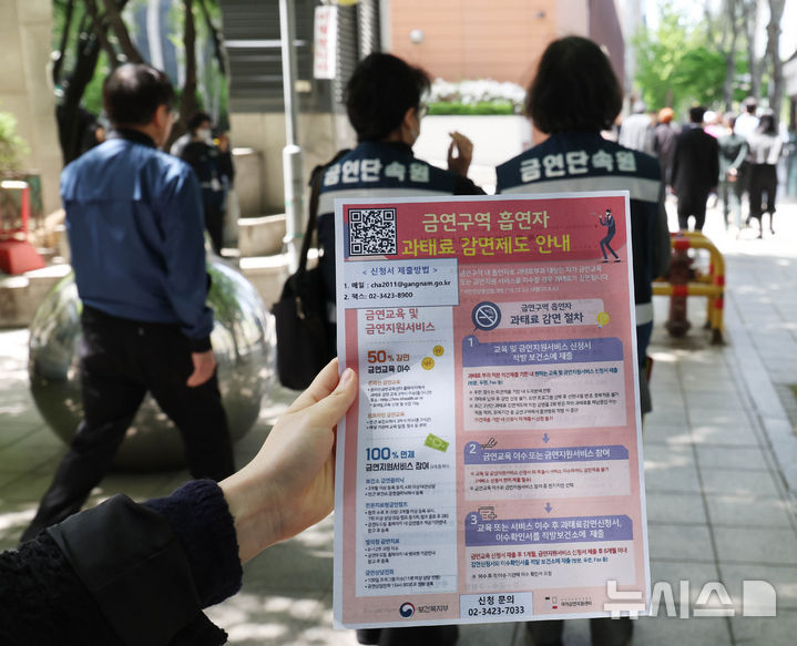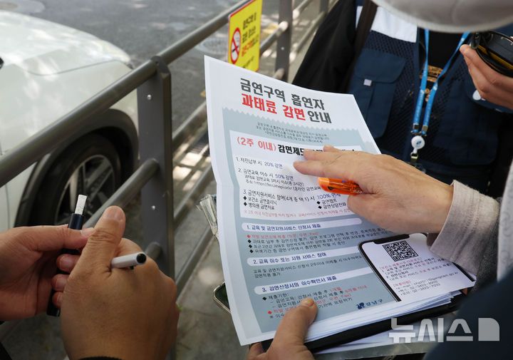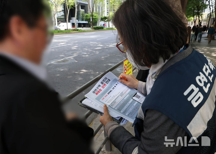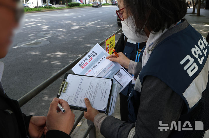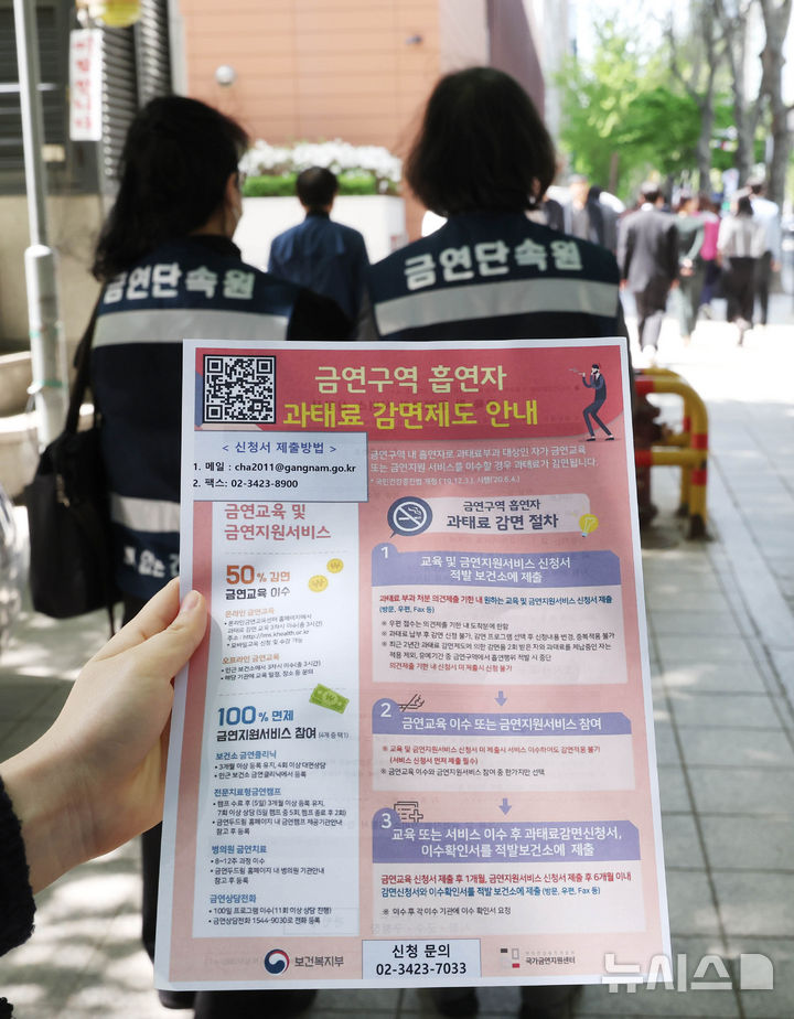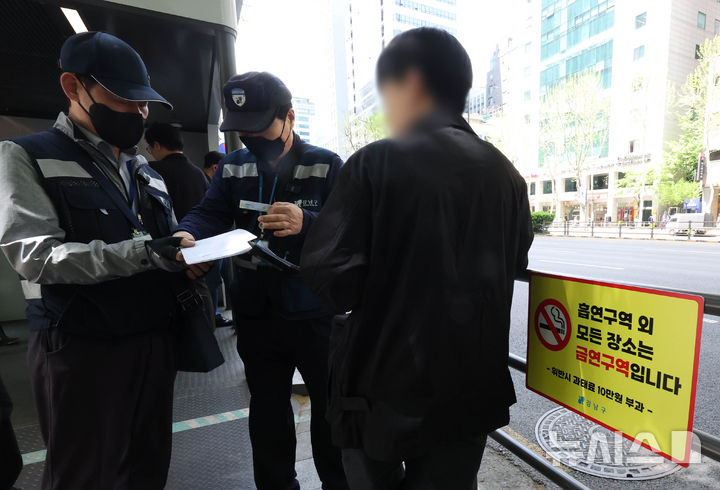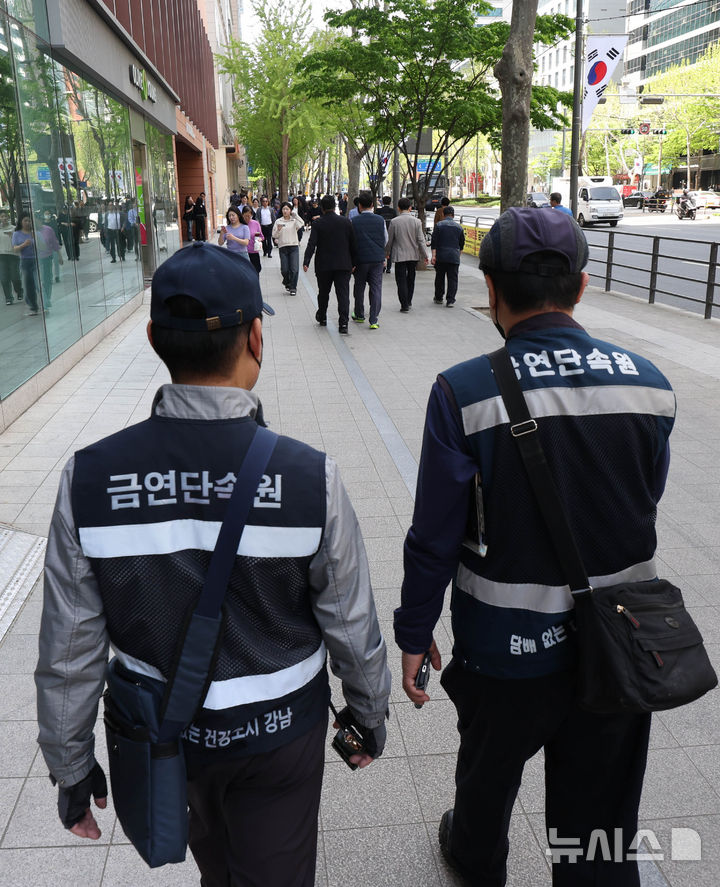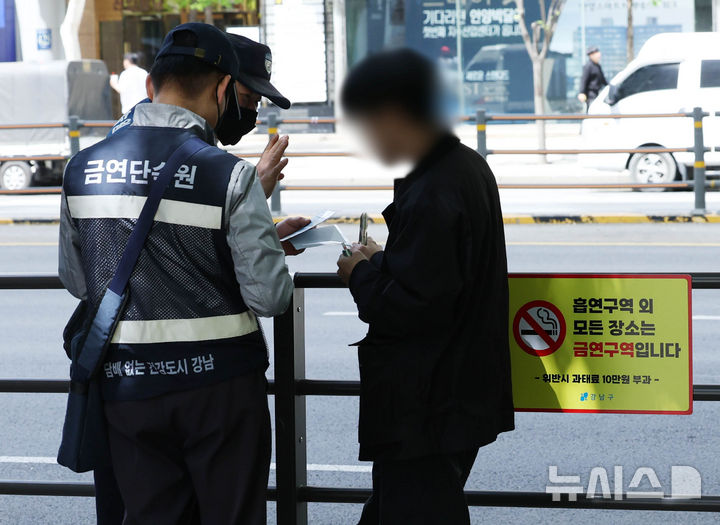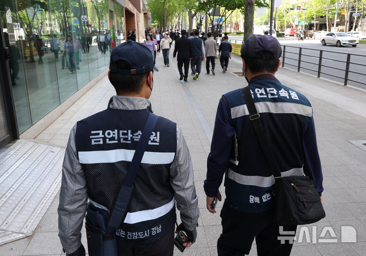 【NEWSIS】江南区庁禁煙取り締まり班のメンバーが23日、ソウル市江南区テヘラン路で路上喫煙の取り締まりを行っている様子。江南区は23日から、テヘラン路の東側および西側の2区間に対する本格的な取り締まりを始めた。取り締まりが行われる区間は、東側宣陵駅2番出口からポスコ交差点まで700メートルの歩道と、西側ケンブリッジ・ビルディングから駅三駅2番出口まで685メートルの歩道。