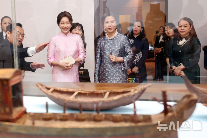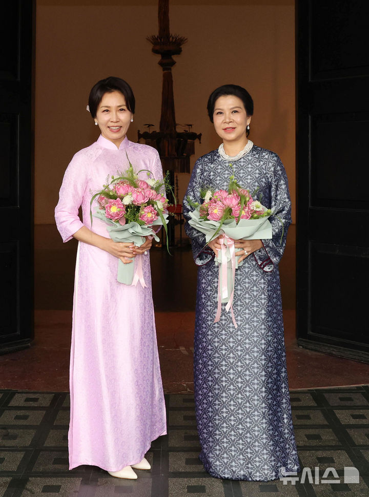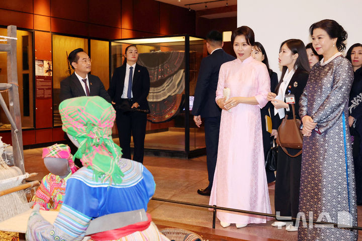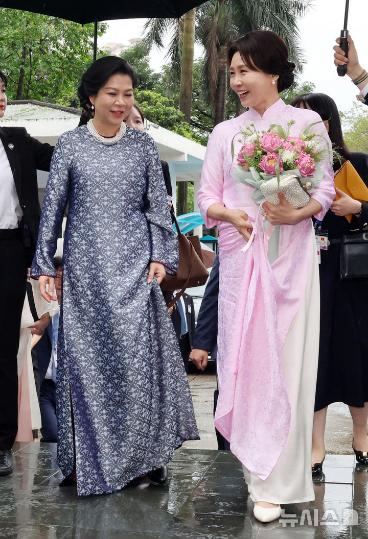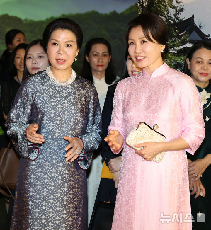 【NEWSIS】韓国の李在明(イ・ジェミョン)大統領の配偶者である金恵京(キム・ヘギョン)夫人と、ベトナムのトー・ラム共産党書記長兼国家主席の配偶者であるゴー・フオン・リー夫人が23日(現地時間)、ベトナム・ハノイの民族学博物館で開かれた親善イベントで対話を交わしつつ移動しているところ。金夫人が着用している服は、ゴー・フオン・リー夫人がプレゼントしたベトナムの伝統衣装「アオザイ」だ。