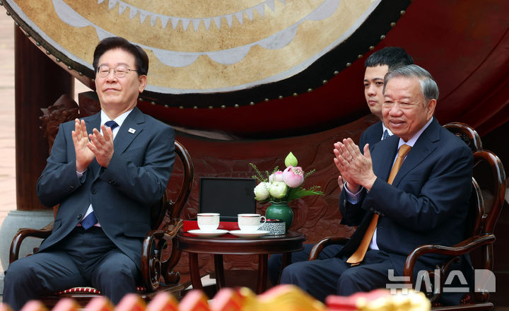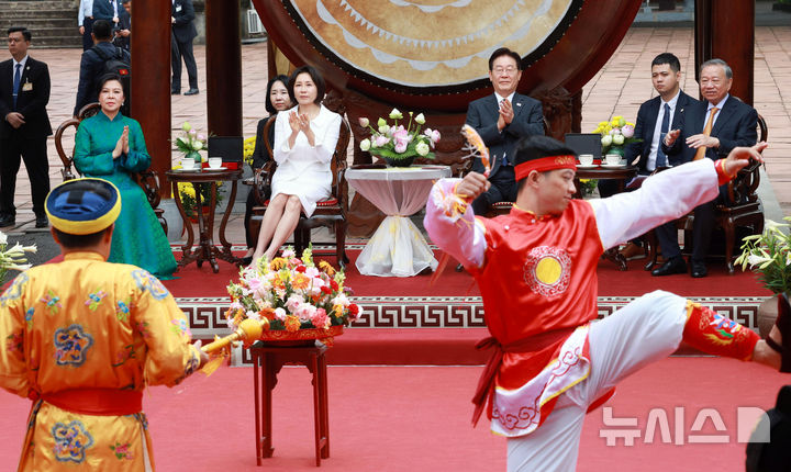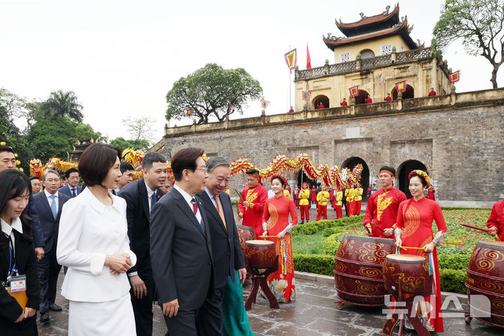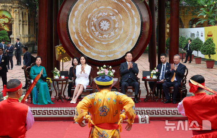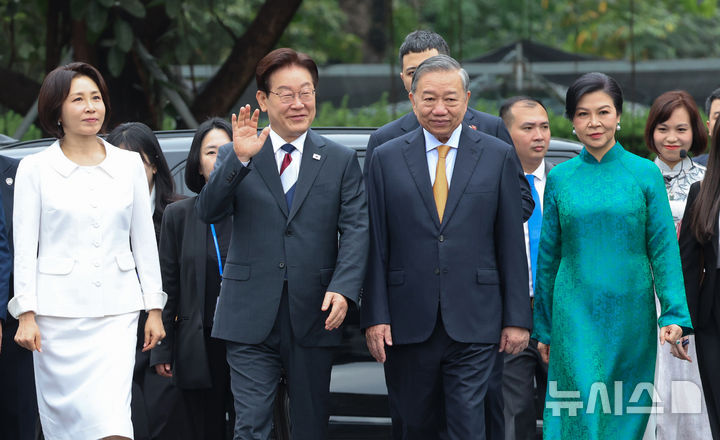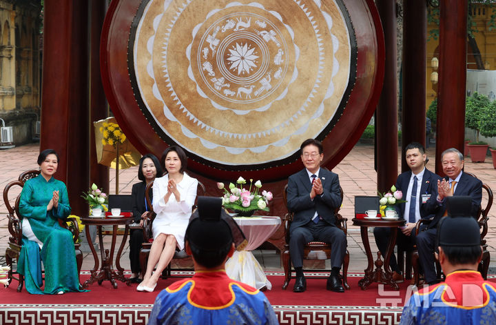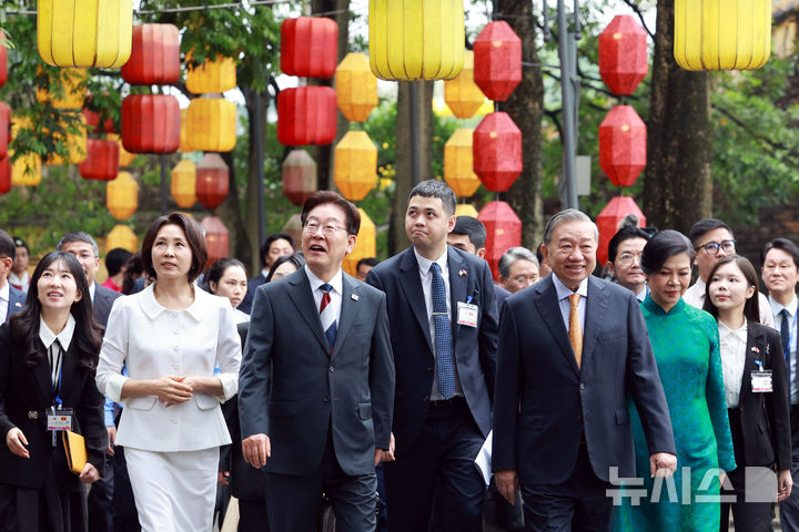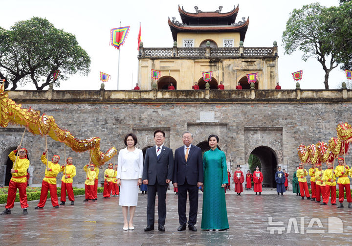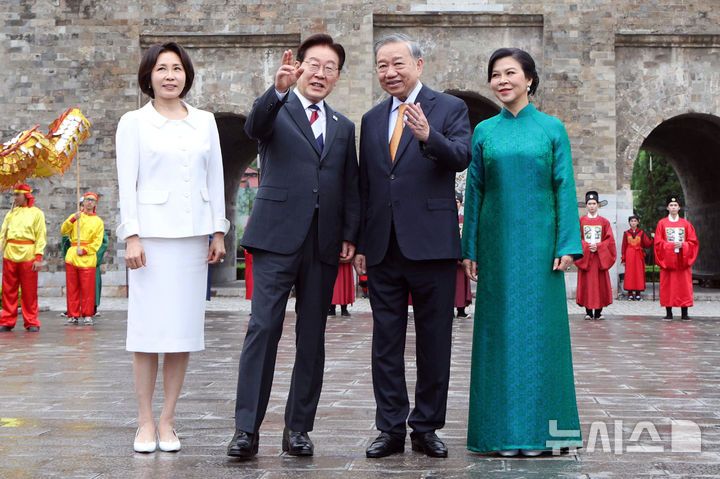 【NEWSIS】韓国の李在明(イ・ジェミョン)大統領と金恵京(キム・ヘギョン)夫人が24日(現地時間)、ユネスコ世界文化遺産に登録されているベトナム・ハノイの昇龍皇城を訪問し、トー・ラム共産党書記長兼国家主席およびゴー・フオン・リー夫人との記念撮影に先立って対話を交わしているところ。