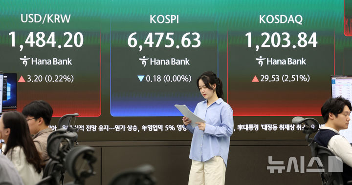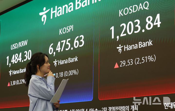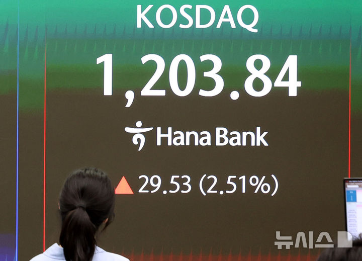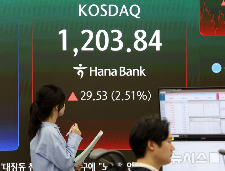 【NEWSIS】KOSDAQ指数が前取引日(1174.31)より29.53ポイント(2.51%)高い1203.84で取引を終えた24日午後、ソウル市中区のハナ銀行ディーリングルームの電光掲示板に終値が表示されている様子。