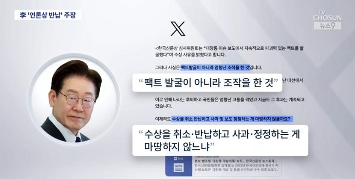 当時、審査委は「破壊力あるファクトを発掘した」と受賞事由を説明しましたが、李在明大統領はきょう午前、SNS(交流サイト)を通して「ファクト発掘ではなく捏造をした」「受賞を取り消し・返納して謝罪・訂正するのが当然ではないか」と主張しました。