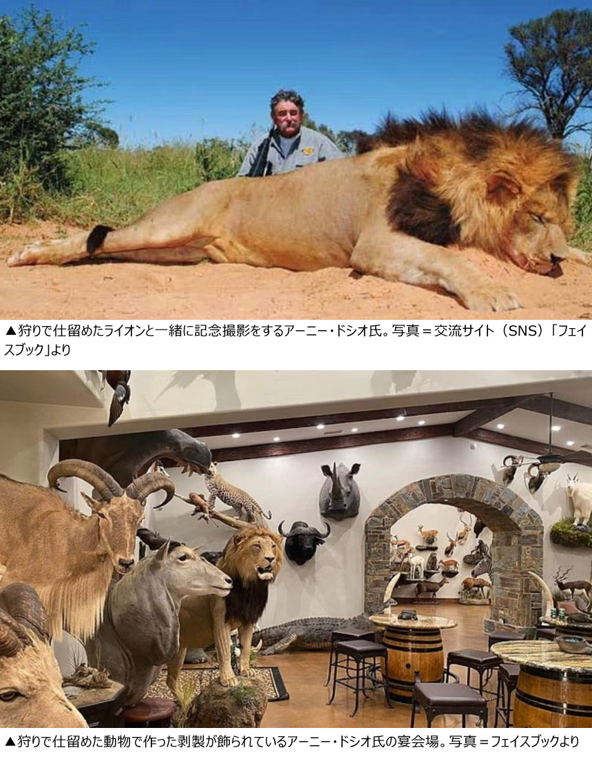 【写真】仕留めたライオンを前に記念撮影するアーニー・ドシオ氏…剥製だらけの自宅写真も
