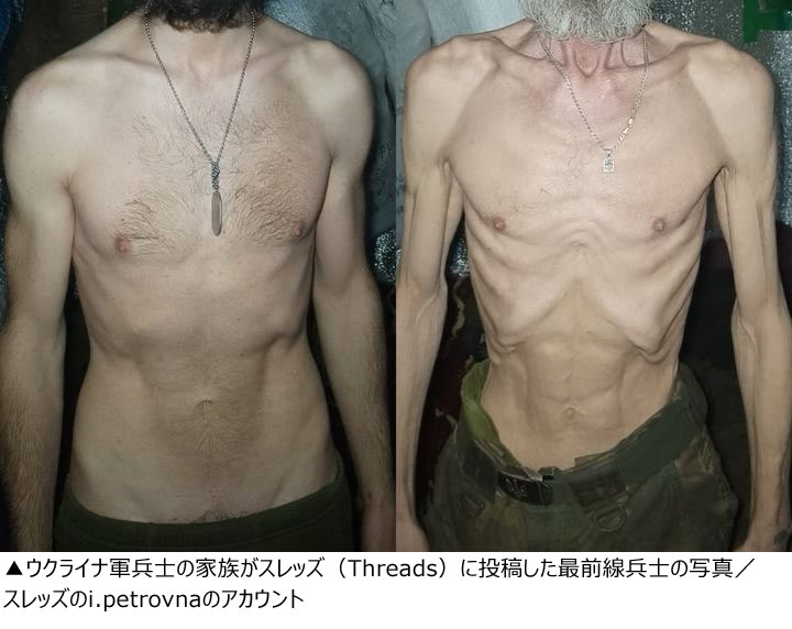 英紙ガーディアンが24日(現地時間)に報じた。それによるとこの問題は第14独立機械化旅団所属兵士の妻アナスタシア・シルツークさんがSNSのスレッズ(Threads)に夫と同僚兵士の写真として投稿したことが発端となった。写真の兵士らは肋骨(ろっこつ)が見え手脚がやせ衰えていた。