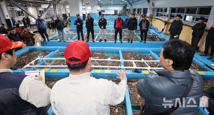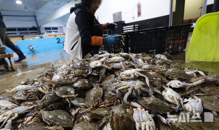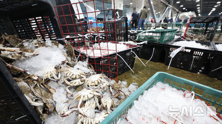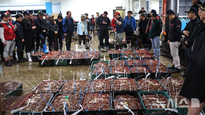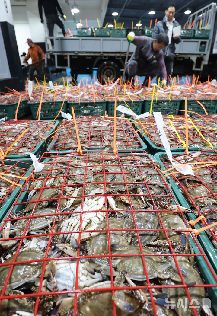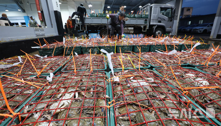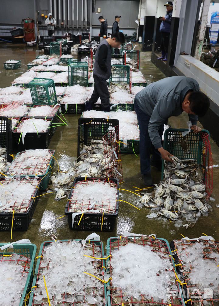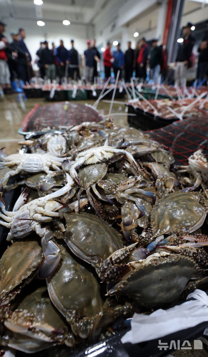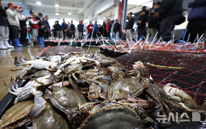 【NEWSIS】漁が解禁され、春のワタリガニの出荷が本格化した27日午前、仁川市中区の京仁西部水産協同組合にある委託販売所で、競りをする業者たち。