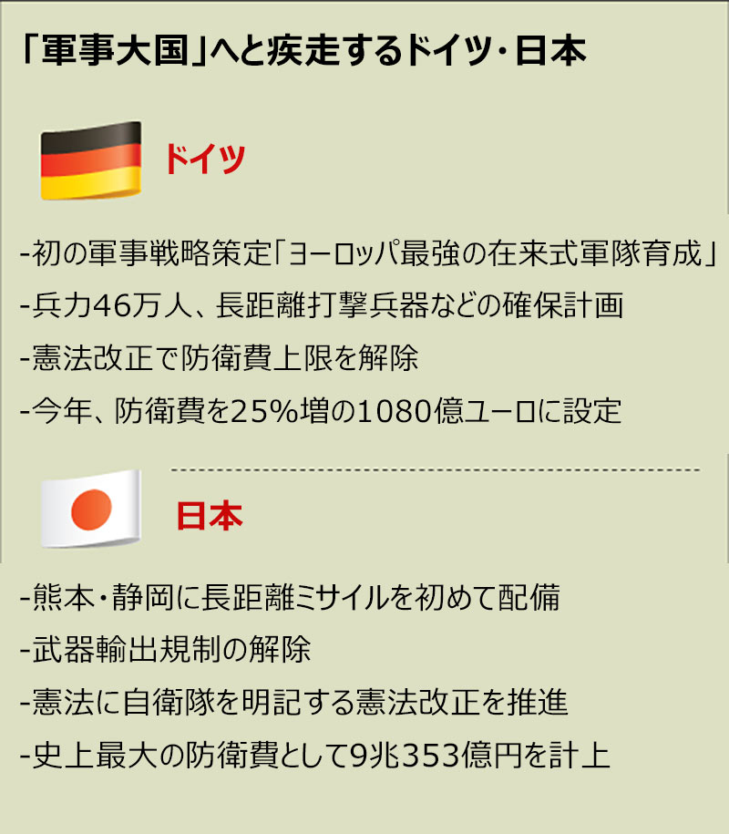 第2次世界大戦の敗戦国であるドイツと日本が本格的な再軍備に乗り出している。両国は戦後の廃墟を乗り越えて再建し、G7(主要7カ国)の一員となり、国連安全保障理事会の常任理事国の座を狙うほど国力が飛躍した。しかし「戦犯国の再武装」と見なされることを極端に嫌い、軍備増強や軍事力行使から距離を置いてきた。しかし、ロシアのウクライナ侵攻、米国・イスラエルとイランの戦争、中国の継続的な台湾への脅威などによって、戦後の国際秩序が揺らぎ、再軍備が加速していると分析されている。