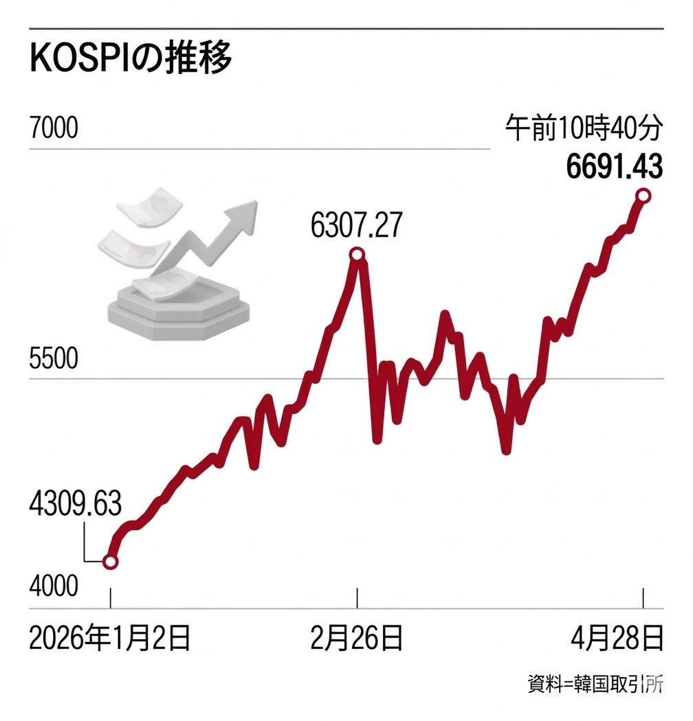 28日午前、韓国総合株価指数(KOSPI、コスピ)は取引時間中に一時1.5%上がって6712.73を記録、同日午前10時30分には6695前後で推移した。個人投資家と外国人投資家が売りに出た一方で、機関投..