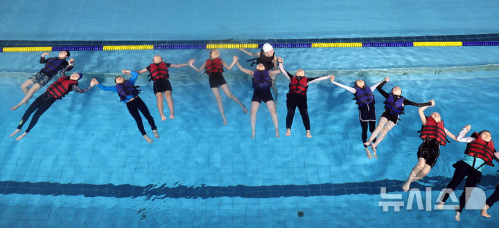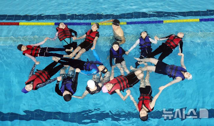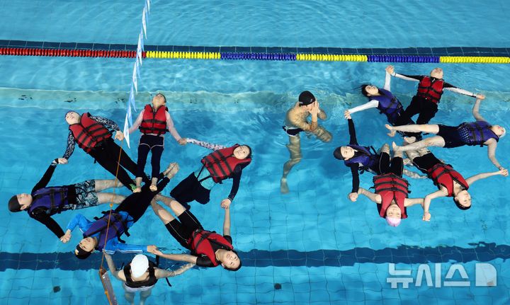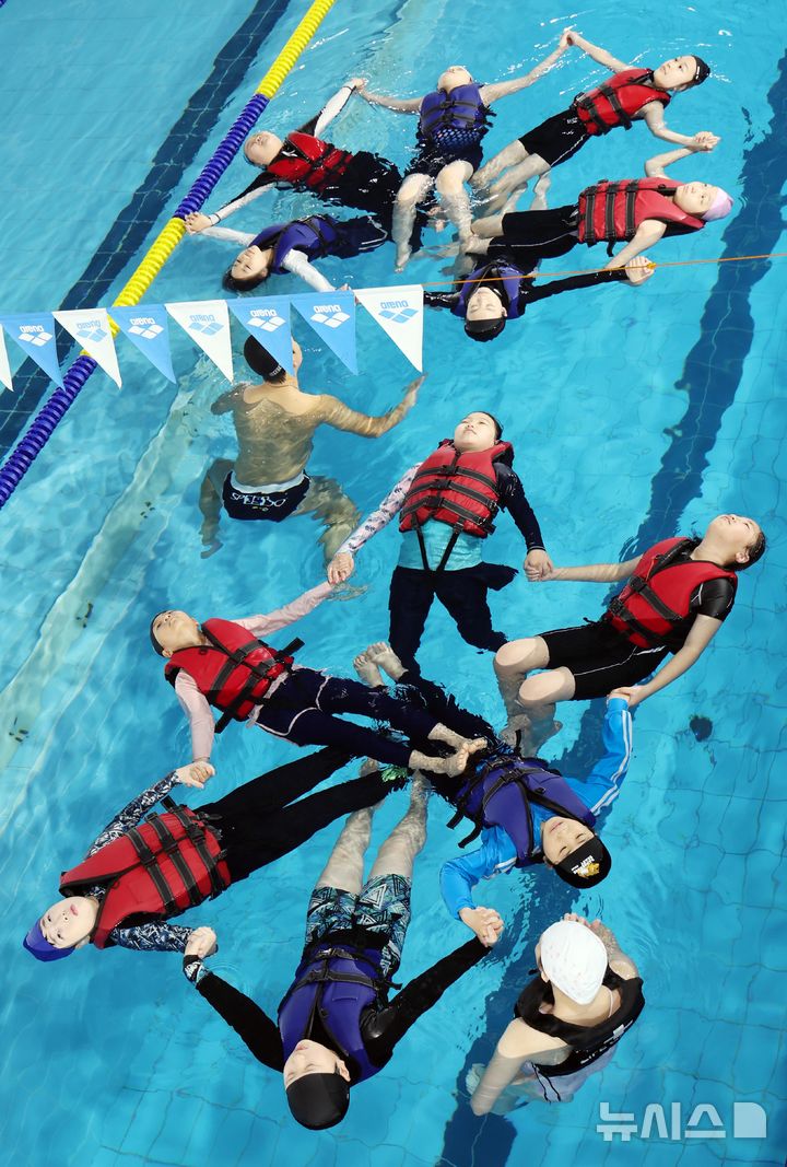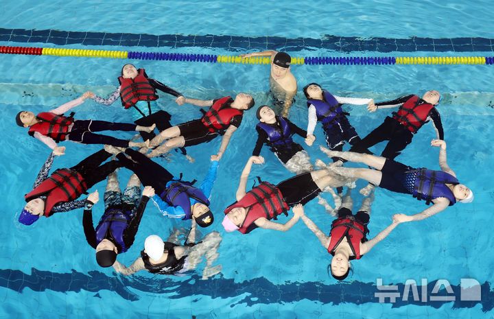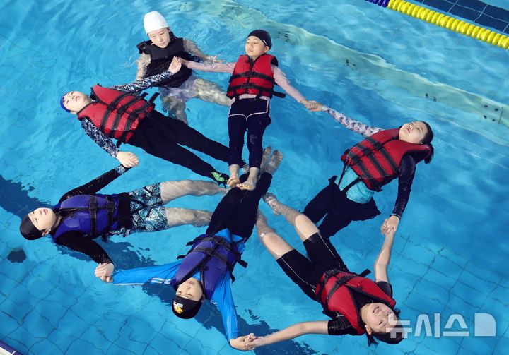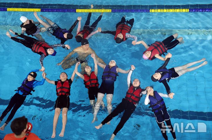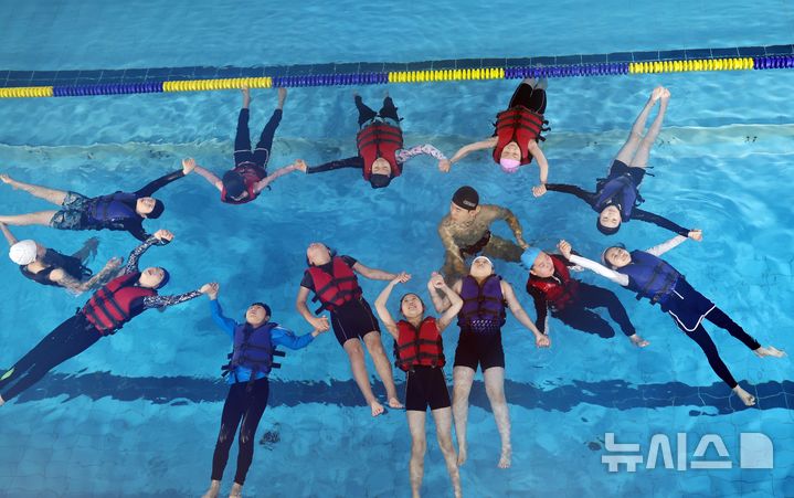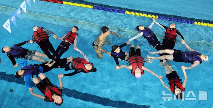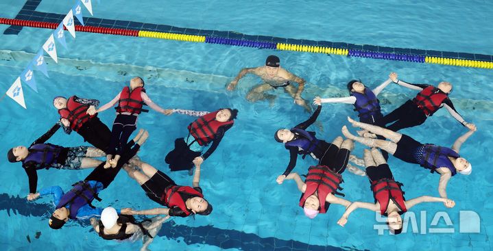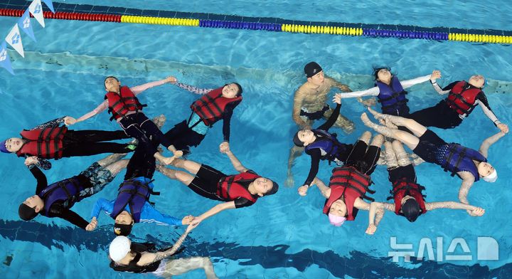 【NEWSIS】釜山市影島区の韓国海洋大学レポーツ・センターで29日、宝水小学校の児童が生存水泳を学んでいる様子。韓国海洋大学は、今年11月30日まで、計50校の小学生およそ7500人を対象に生存水泳教育を行う。