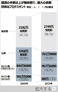 注目すべきことは、1995年と2005年の調査で常に1位を守ってきた仏教が2位に落ちて、これまで2位だったプロテスタントが1位にのし上がったことだ。仏教は全回答者のうち1995年に23.2%、2005年に22.8%と、95年に19.4%、05年に18.2%だったプロテスタントよりも信徒数が多かったが、今回の調査で順位が入れ替わった。