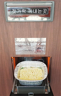 最近ソウル市麻浦区延南洞で自動販売機を利用した無人のラーメン屋が人気を呼んでいる。約13平方メートルの店内には、厨房(ちゅうぼう)の代わりにラーメン製造・販売機が3台設置されている。それぞれ韓国風、日本風、無国籍ラーメンの販売機だ。クレジットカードで3000-4000ウォン(約300-400円)を決済すると、3分後にはラーメンが出てくる。オーナーのシン・ヒョンギョンさんは「最近は人件費が高い上、家賃も高騰しているため、こういったやり方でなければ、収益は出しにくい。人間に代わって機械を利用するようになったことで、週末や夜勤の手当ても出す必要がなく、年中無休で運営できる」と笑みを浮かべる。