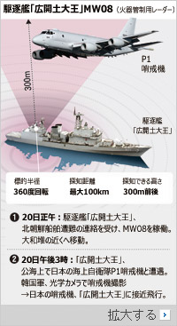 韓国軍関係者の話を総合すると、韓国軍は同日正午ごろ、北朝鮮の船舶が遭難したとの連絡を受け、火器管制用レーダー(MW08)の「対艦用モード」を稼働させた。一般航海用レーダーより精密な火器管制用レーダーを使って小さな北朝鮮船舶を捜索しようという考えだった。遭難した北朝鮮船舶の捜索に当たっていた駆逐艦「広開土大王(クァンゲト・デワン)」が大和堆(たい)南側の韓日中間水域で日本の海上自衛隊P1哨戒機に遭遇したのは同日午後3時ごろだったと推定される。