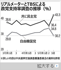リアルメーターがTBS放送の依頼を受け今月13-15日に実施した政党支持率調査によると、共に民主党の支持率は43.3%、自由韓国党は30.2%だった。1週間前の7-8日に行われた同様の調査と比較すると、共に民主党は36.4%から6.9ポイント上昇し、自由韓国党は34.8%から4.6ポイント下がった。