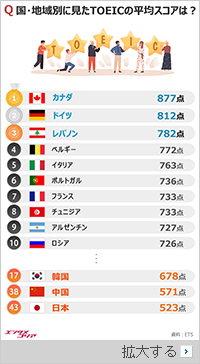韓国TOEIC委員会は5月6日、TOEICの試験を主管する米国の非営利団体である教育試験サービス(ETS)が昨年、各国・地域のTOEIC受験者の成績を分析した結果、このようなことが分かったと発表。