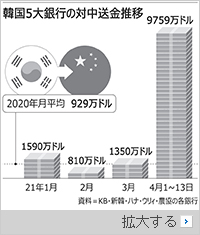 韓国の5大銀行(国民・新韓・ウリィ・ハナ・農協)の今年の月別非居住者(外国人居住者含む)による海外送金の推移を見ると、4月1-13日までの対中送金額は9759万ドルだった。昨年の月平均(929万ドル)の10.5倍に達する。一方、同じ期間に中国以外の国への送金額はコロナの影響などで43%減の1億5428万ドルだった。国会政務委員会の成一鍾(ソン・イルジョン)議員が金融監督院から提出を受けた資料だ。対中送金額は年初来、1月が1590万ドル、2月が810万ドル、3月が1350万ドルと例年並みの水準を前後していたが、今月に入って激増した。市中銀行関係者は「中国の仮想通貨投資家が『キムチプレミアム』による差益を得て、多額の送金を行ったとしか説明がつかない」とし、「個人投資家レベルを超え、組織的な動きを見せているようだ」と指摘した。特に人民元建ての送金が集中している支店はソウル大林洞、仁川市、京畿道富川市など中国人密集地域だという。