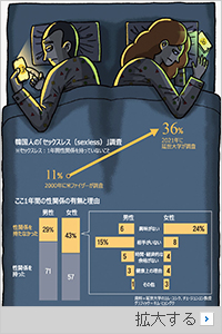 「ここ1年間、性関係を持っていない」と答えた人は全体の36%だった。性別では女性(回答者の43%)が男性(29%)よりも高かった。理由は微妙に異なっていた。性的関係を持たない男性の半数以上は「パートナーがいないため」と答えた。一方で女性の半数以上は「興味がないため」と答えた。男性は「できなかった」が、女性は「しなかった」というわけだ。ヨム教授は「非婚や少子化、女性の社会的地位向上などが原因とみられる」と話した。互いの合意が必要な性関係から、もはや女性の主導権が拡大したというわけだ。また、女性が出産後、夫との寝床を避け、子どもに気を使いながら子どもと一緒に寝る傾向が高いことも一つの要因だ。