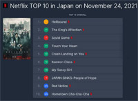 コンテンツ統計サイト「フリックスパトロール」によると、24日現在、日本のネットフリックスではトップ10のうち7本が韓国ドラマだ。1位は『地獄が呼んでいる』、次いで『恋慕』、『イカゲーム』、『真心が届く』、『愛の不時着』、『梨泰院クラス』と6位まで全て韓国の作品だ。10位には『海街チャチャチャ』が入っている。日本の作品は『日本沈没:希望のひと』だけだ。