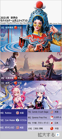中国ゲームは、『王者栄耀(えいよう)』(グローバルバージョン含む)と『和平精英(Game for Peace)』がしのぎを削りつつ1位、2位を守っただけでなく、多様なジャンルのゲームがトップランキングに名を連ねた。2019年にはNetEaseのMMORPG『夢幻西遊』(9位)、2020年にはLilith gamesの戦略ゲーム『Rise of Kingdoms -万国覚醒-』(8位)、昨年はmiHoYoのオープンワールド型RPG『原神』(3位)とQookka Gamesの歴史SLG『三国志 真戦』(10位)が世界的な人気を集めた。昨年、中国ゲーム『王者栄耀』と『和平精英』『原神』が世界市場で得た売り上げだけでも74億ドル(約8400億円)に達する。