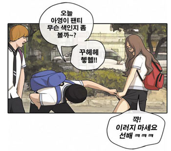 男性主人公は、彼女が浮気するのを見て「女性に対して嫌悪感を抱くようになった」という。女子学生の肩に腕を掛け、スキンシップもする。女子学生が抵抗するが、男性は「本当は喜んでいるくせに、悪い男が引かれる理由がここにある」と笑う。男性がよく見るウェブトゥーン(ウェブ漫画)でトップ人気を誇る「外見至上主義」のエピソードの一つ。同ウェブトゥーンは「キムチ」「顔だけが取りえのX」など、さまざまな女性に対する嫌悪的表現で論議を呼んだものの、2014年から引き続き連載されている。
