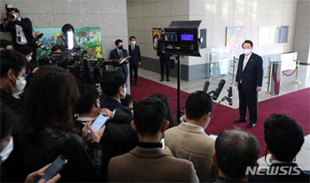 大統領室はこの日、ぶら下がり会見が行われる庁舎1階に仕切りの幕を設置した。大統領室は「今月2日に非公開で行われた外国代表団接見の際、一部の出入り記者が一方的に代表団を撮影したことがあった」「1階の構造物の設置はこの件をきっかけに協議されたもので、大統領のぶら下がり会見とは無関係だ」と説明した。大統領室関係者は「1階の空間は完全にオープンになっているため、外交的にもすべての状況が露出するのは望ましくないという意見があり、仕切りを設置した」と語った。