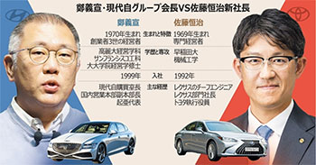 佐藤氏の登場で、自動車業界では同年代の鄭義宣(チョン・ウィソン)現代自動車グループ会長(52)との競争の構図に注目が集まっている。韓日を代表する自動車メーカーのプライドを懸けた対決である以外に、カーマニアと呼ばれ、技術一筋で努力してきた姿が似ているからだ。電気自動車(EV)やコネクテッドカーなどへのパラダイムシフトが進む業界の特性上、2人の歩みによって世界の自動車業界地図も変化する可能性が高い。