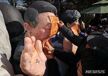 彼らの集会には造形物や象徴物が欠かせない。参加者らは、ある日はサイズが2メートル近くある尹錫悦(ユン・ソンニョル)大統領の造形物を引っ張り出し、ある日は膝を屈した尹大統領の像の額にお札をべたべたと貼ったりもした。顔を大きく描いて「背倫尹錫悦」と記した、往復10車線の道路をふさぐほど大きい掛け図を広げておいて、ずたずたに引き裂くイベントをやった日もある。