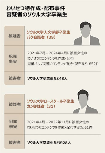 後輩女性学生の顔写真にわいせつな写真や動画を合成し、これを流布したソウル大出身の2人の男が逮捕された翌日の22日、ソウル大学冠岳キャンパスは落ち着かない雰囲気だった。逮捕された主犯のパク容疑者(39)はソウル大学人文学部卒業生で、カン容疑者(31)は社会学部卒業生だった。二人がソウル大学の卒業生だった事実に教授や学生たちは「衝撃だ」と語る。二人は在学中に外務考試(外交官試験)や司法試験などに何度も挑戦したがいずれも合格には至らず、二人とも未婚で無職の状態だという。二人はテレグラムのチャットなどを通じてソウル大学の後輩女性らの顔を合成した写真を数年にわたり制作し、これを広めた疑いがある。