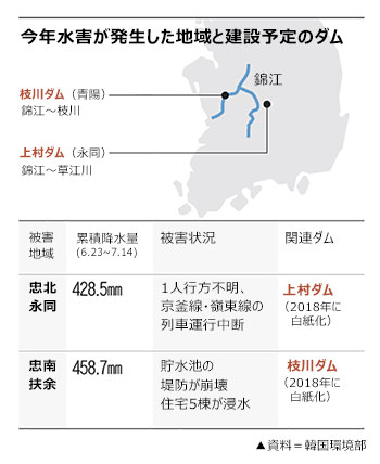上村ダムは、忠清北道永同郡の草江川付近に建設される予定だった。総貯水量1900万トン、洪水調節容量は300万トンという計画だった。しかし、「4大河川事業」以降、大規模な土木事業に反対していた文政権は、上村ダムを含め長期的に計画されていたダム建設を全て中止した。さらに環境団体などによる反対も建設中止を後押しした。忠清地域で梅雨が始まった先月23日から現在までに、永同郡には428.5ミリの雨が降った。忠清地域では梅雨の全体降水量が平年360.7ミリだが、これをはるかに上回る量の雨が降ったのだ。特に今月6-10日には忠清地域に停滞した梅雨前線の影響で、5時間で120ミリの集中豪雨に見舞われ、河川が氾濫して1人が行方不明になったほか、京釜線・嶺東線の列車が運行を見合わせた。予定通りに上村ダムが建設されていれば上流で水を貯めておけたため、下流での被害を最小限に抑えることができたはずとの分析が示されている。