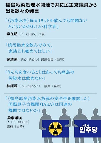 昨年夏に共に民主党は週末ごとに汎(はん)国民大会を開催した。7月1日にソウル市中心部の崇礼門近くで開いた集会では、鄭清来(チョン・チョンレ)議員が「核汚染水を飲んでみて、家族にも勧めてほしい」と述べ、林鍾声(イム・ジョンソン)議員は「うんちを食べることはあっても福島の汚染水は飲めない」とまで発言した。