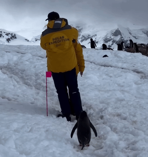 動画を見ると、観光を楽しんでいる仲むつまじいカップルが互いに肩を組みながら南極の景色を楽しんでいたところ、その後ろに1羽のペンギンが現れた。