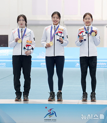 【NEWSIS】9日(現地時間)、中国・ハルビンの黒竜江スピードスケートオーバルで行われた2025ハルビン冬季アジア大会スピードスケート女子チームスプリントの授賞式で、金メダルを手にポーズする韓国代表のキム・ミンジ、イ・ナヒョン、金ミン鮮(キム・ミンソン)。