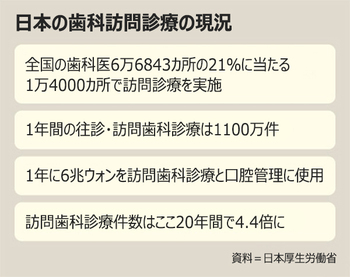 日本は2000年代初め、65歳以上の高齢人口の占める割合が20%を超える超高齢社会に突入し、一般医師の訪問診療はもちろんのこと、訪問歯科診療を本格的に導入した。現在では、全国の歯科医院6万6843カ所のうち、約21%に相当する1万4000カ所が訪問歯科診療を実施している。ある医院で月平均70件余りの訪問診療が行われている。これを基に計算すると、1年間の訪問歯科診療件数はざっと1100万件と推算される。