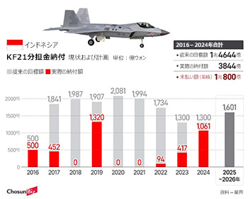 事業の満了が約1年後に迫っているが、インドネシアがこれまでに納付した金額は4000億ウォンにとどまっている。これはKF21の開発分担金総額(1兆6000億ウォン)の25%だ。インドネシアは財政難を理由に分担金の削減を要請している。韓国政府は昨年8月、インドネシアの分担金を6000億ウォンに減額する調整案を提示した。これを基に、インドネシアは24-26年に年平均1070億ウォンを納付する予定だという。
