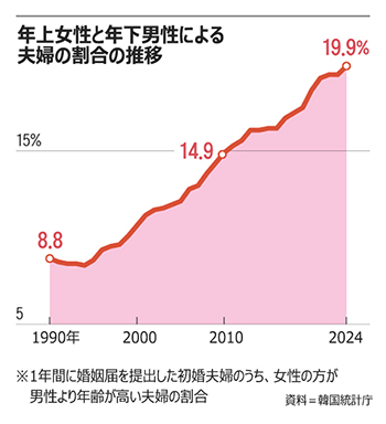 初婚の年上女性と年下男性による新婚夫婦のうち、女性の方が男性よりも10歳以上年上のケースも400件に達した。こうした現象は、年上の夫がお金を稼ぎ、年下の妻が家事を担うという伝統的な夫婦像が崩れた影響だと受け止められている。むしろ、兵役など経済活動の空白期間がなく、先に仕事を始めた女性の方がお金を稼ぎ、後に仕事を始めた男性と結婚するケースが増えているということだ。