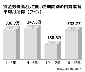 所得は、賃金労働者として働いた期間によってU字型になっている。起業前の賃金労働期間が1-3年の高齢自営業者の平均月所得は338万7000ウォン、4-6年は347万3000ウォンだったが、10-12年は188万6000ウォンと低かった。16-17年の場合は再び333万7000ウォンに上がっている。早い時期に自営業者になったり、賃金労働者としての長年の経験を生かしたりした場合は所得が高いが、途中で押し出されるように自営業を始めた場合は所得が低いものと推定される。
