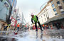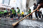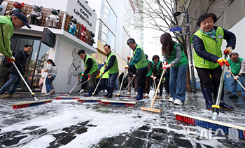 【NEWSIS】16日、ソウル市中区のショッピング街・明洞で、春の大掃除をする金桔城(キム・ギルソン)同区長、商店街関係者、ボランティアたち。